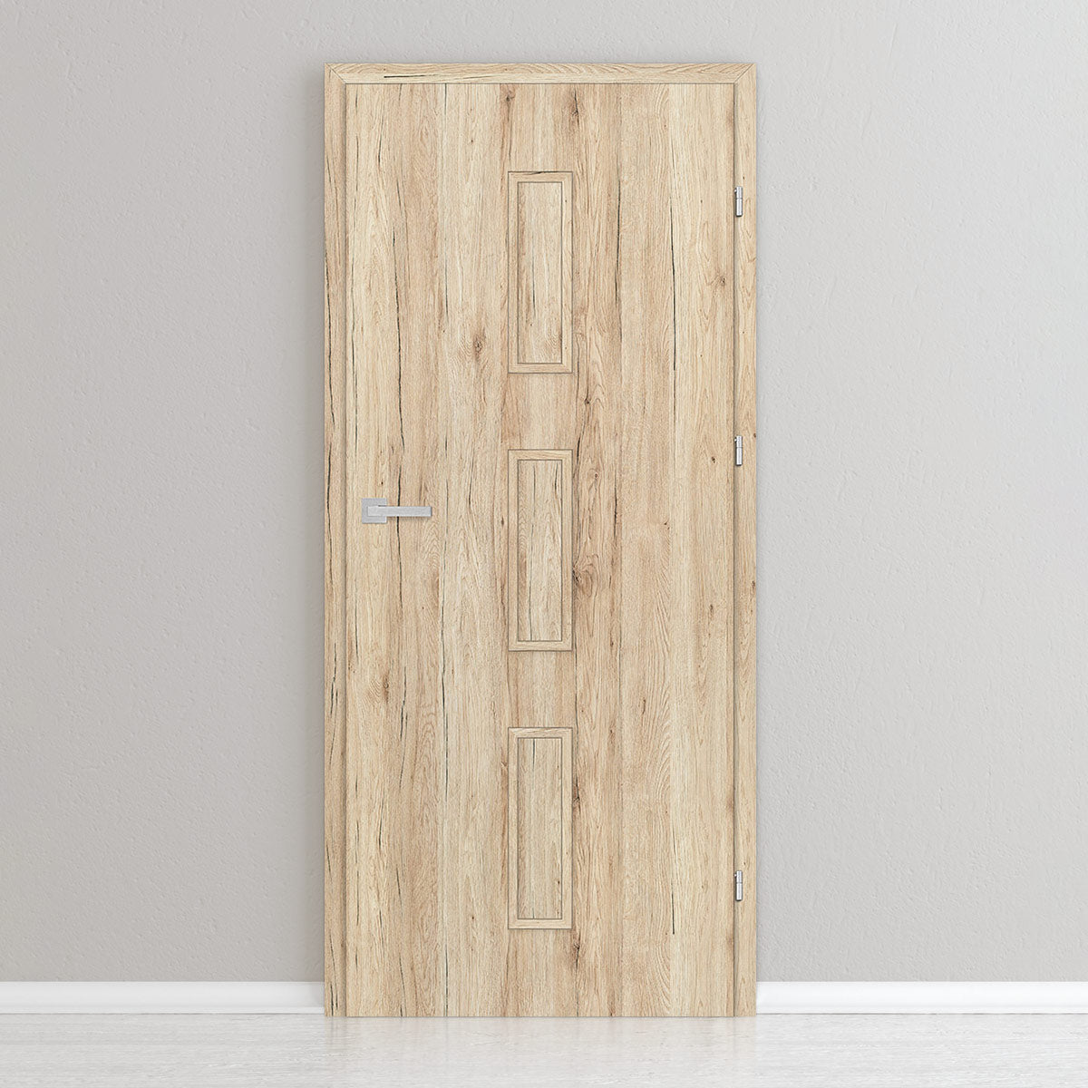 • ръб (завършване по технология стандарт или безфалцово) покрит с лента в цвета на крилото на вратата или опционално в черен цвят, гладък (в декор ДЪБ НАТЮР НАПРЕЧЕН PREMIUM черен ръбо с напречна структура)
