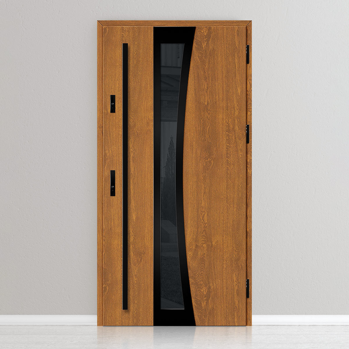 Врата су израђена од поцинкованог челичног лима дебљине 0,6мм и ПВЦ облога. Крило је испуњено полиуретанском пеном густине 750г/м3, а рам је од лепљеног боровог дрвета. ПВЦ премаз карактерише висока отпорност на промене временских услова, УВ зрачење и механичка оштећења. Текстура прилагођена декоративном мотиву ствара производ високе естетске вредности, поред његових безбедносних и провалних квалитета.