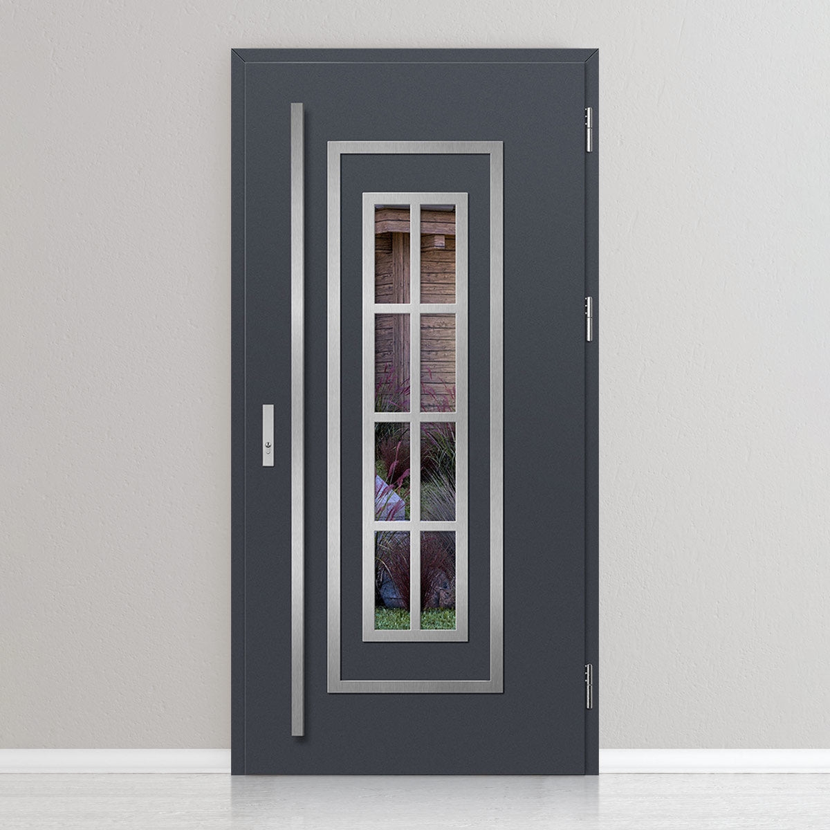 Врата су израђена од поцинкованог челичног лима дебљине 0,6мм и ПВЦ облога. Крило је испуњено полиуретанском пеном густине 750г/м3, а рам је од лепљеног боровог дрвета. ПВЦ премаз карактерише висока отпорност на промене временских услова, УВ зрачење и механичка оштећења. Текстура прилагођена декоративном мотиву ствара производ високе естетске вредности, поред његових безбедносних и провалних квалитета.