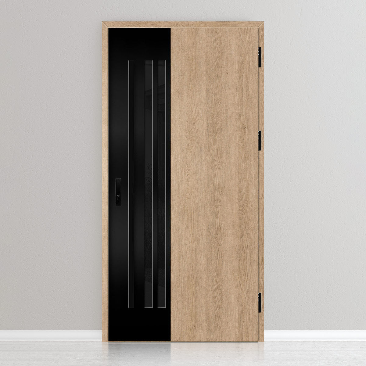 Врата су израђена од поцинкованог челичног лима дебљине 0,6мм и ПВЦ облога. Крило је испуњено полиуретанском пеном густине 750г/м3, а рам је од лепљеног боровог дрвета. ПВЦ премаз карактерише висока отпорност на промене временских услова, УВ зрачење и механичка оштећења. Текстура прилагођена декоративном мотиву ствара производ високе естетске вредности, поред његових безбедносних и провалних квалитета.