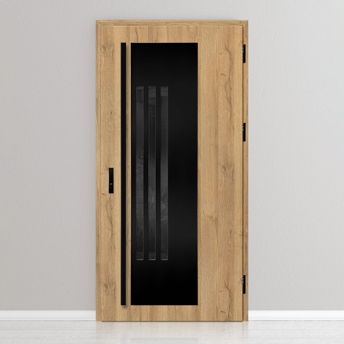 Врата су израђена од поцинкованог челичног лима дебљине 0,6мм и ПВЦ облога. Крило је испуњено полиуретанском пеном густине 750г/м3, а рам је од лепљеног боровог дрвета. ПВЦ премаз карактерише висока отпорност на промене временских услова, УВ зрачење и механичка оштећења. Текстура прилагођена декоративном мотиву ствара производ високе естетске вредности, поред његових безбедносних и провалних квалитета.