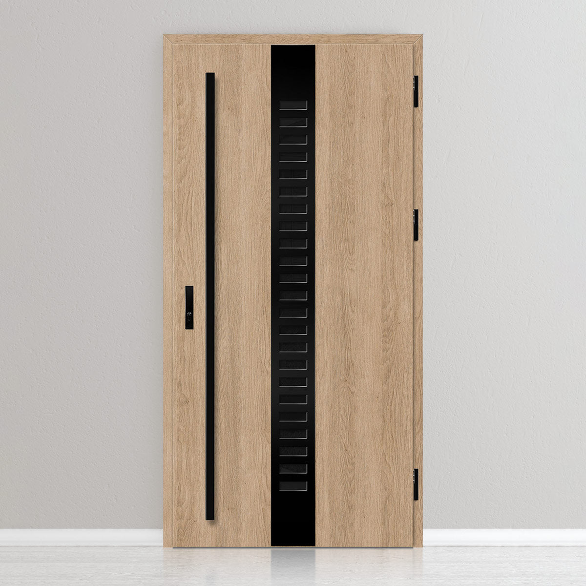Врата су израђена од поцинкованог челичног лима дебљине 0,6мм и ПВЦ облога. Крило је испуњено полиуретанском пеном густине 750г/м3, а рам је од лепљеног боровог дрвета. ПВЦ премаз карактерише висока отпорност на промене временских услова, УВ зрачење и механичка оштећења. Текстура прилагођена декоративном мотиву ствара производ високе естетске вредности, поред његових безбедносних и провалних квалитета.