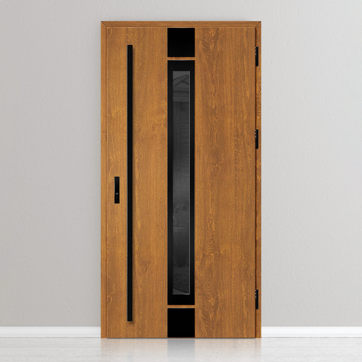 Врата су израђена од поцинкованог челичног лима дебљине 0,6мм и ПВЦ облога. Крило је испуњено полиуретанском пеном густине 750г/м3, а рам је од лепљеног боровог дрвета. ПВЦ премаз карактерише висока отпорност на промене временских услова, УВ зрачење и механичка оштећења. Текстура прилагођена декоративном мотиву ствара производ високе естетске вредности, поред његових безбедносних и провалних квалитета.