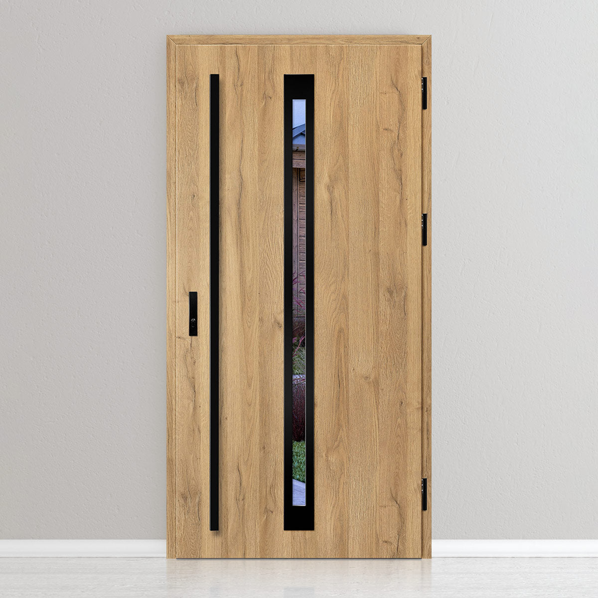 Врата су израђена од поцинкованог челичног лима дебљине 0,6мм и ПВЦ облога. Крило је испуњено полиуретанском пеном густине 750г/м3, а рам је од лепљеног боровог дрвета. ПВЦ премаз карактерише висока отпорност на промене временских услова, УВ зрачење и механичка оштећења. Текстура прилагођена декоративном мотиву ствара производ високе естетске вредности, поред његових безбедносних и провалних квалитета.