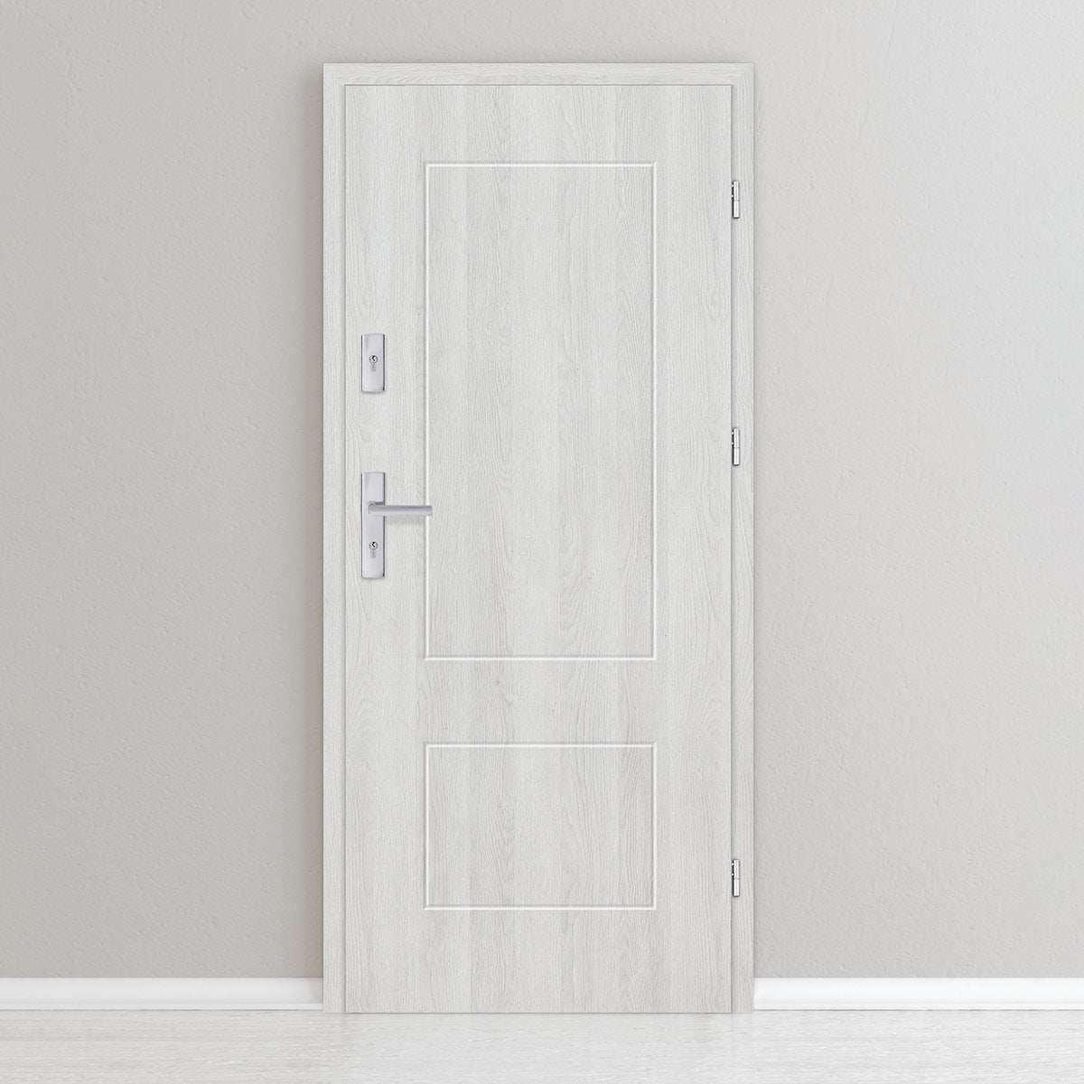 ГОЛД пакет : Крило врата са неподесивим оквиром, праг од нерђајућег челика и окови који се састоје од ЕССЕН Сатин Ницкел ручке, горње браве, уметци са 1 системом кључа (горњи са куглом), визир (без избушене рупе) у сребрној боји или уз доплату у црној боји.